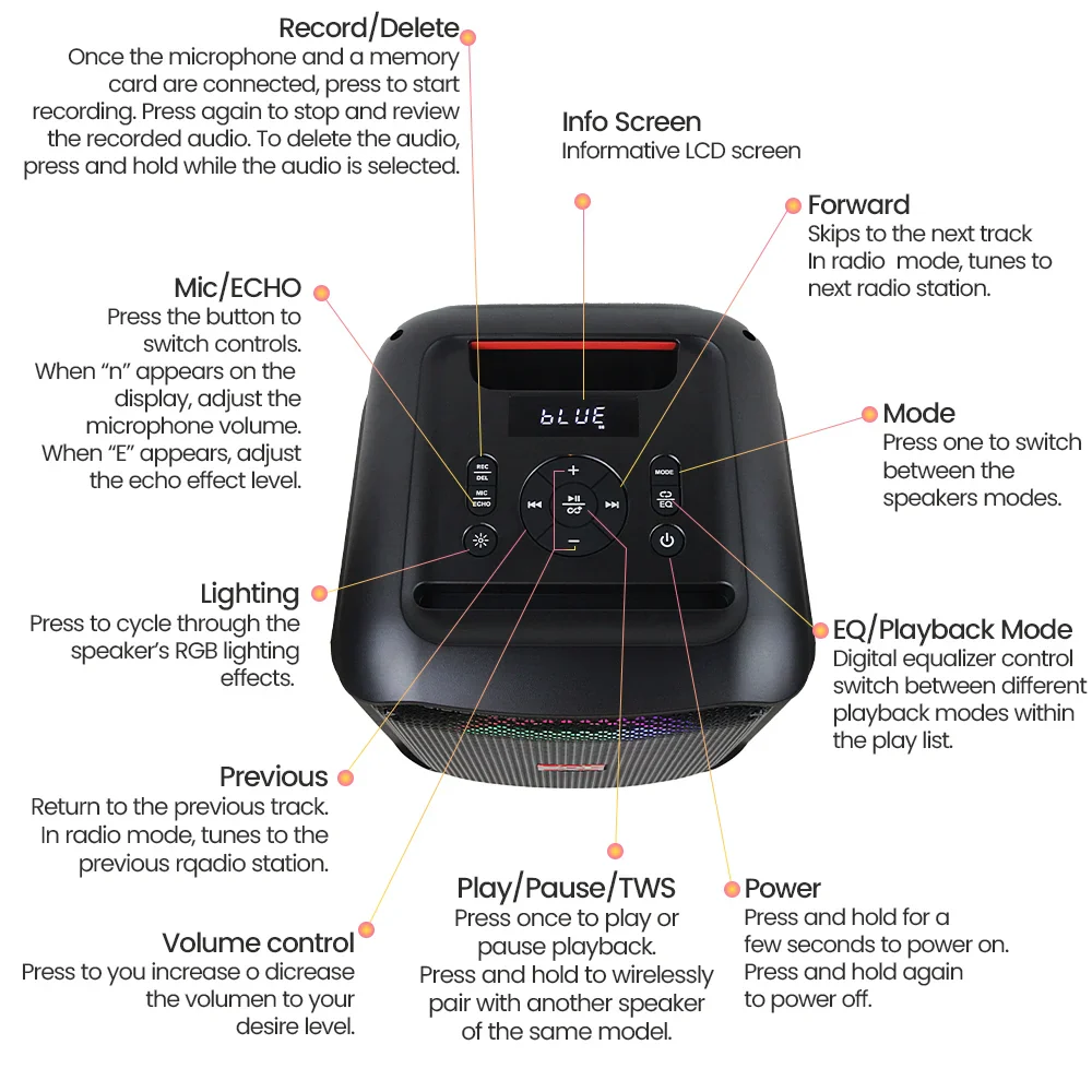 ตอบโจทย์ทุกความบันเทิงในเครื่องเดียว ไม่ว่าจะร้องคาราโอเกะ จัดงานปาร์ตี้เล็กๆ หรือใช้งานนอกสถานที่ ด้วยพลังเสียงที่คมชัดและฟังก์ชันการเชื่อมต่อที่ครบครัน พร้อมระบบ TWS (True Wireless Stereo) ที่ช่วยให้คุณเชื่อมต่อลำโพงรุ่นเดียวกัน 2 ตัวเข้าด้วยกันแบบไร้สาย เพื่อเสียงสเตอริโอที่โอบล้อมและทรงพลังยิ่งขึ้น